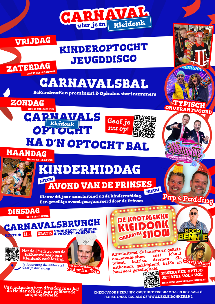 Het programma voor carnaval 2026 in Kleidonk is bekend. Van vrijdag tot en met woensdag staat ons dorp weer in het teken van carnaval, met muziek, bekende onderdelen en ook een paar nieuwe momenten.